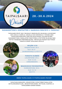 Kesä koittaa ja kesätapahtumat sen myötä. Taipalsaari-päivät ovat 28-30.6. ja niiden osatapahtuma, Maaseudun perinnepäivä, on 30.6. Paljon on valmisteluja tehty ja ohjelma on nyt kuta kuinkin valmis. Tänä vuonna perinnepäivän alussa lakitetaan uusi Taipalsaaren kippari. Tapahtumista kannattaa kertoa naapurustoon ja lähipiirillekin. Mielenkiintoista ohjelmaa kaiken ikäisille on tarjolla.