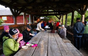 Muonitusosastot valmistautumassa laskijaisriehaajia palvelemaan. Kahvia, teetä, mehua, pullaa ym. herkullista tarjottavaa meni runsaasti. ”Soppatykistä” riitti maittavaa hernerokkaa kaikille halukkaille, vaikka varatusta n.100:sta litrasta ei tähettä jäänytkään. Makkaran paistopisteitä oli kahdessa paikassa. Toinen tässä rokkaosaston vieressä, toinen laskijaismäen yläosassa. Makkaranpaistajilla ajoittain hyvinkin kiireisiä hetkiä, niin piti ollakkin. Tärkein kaikessa, makkara ei kesken loppunut.